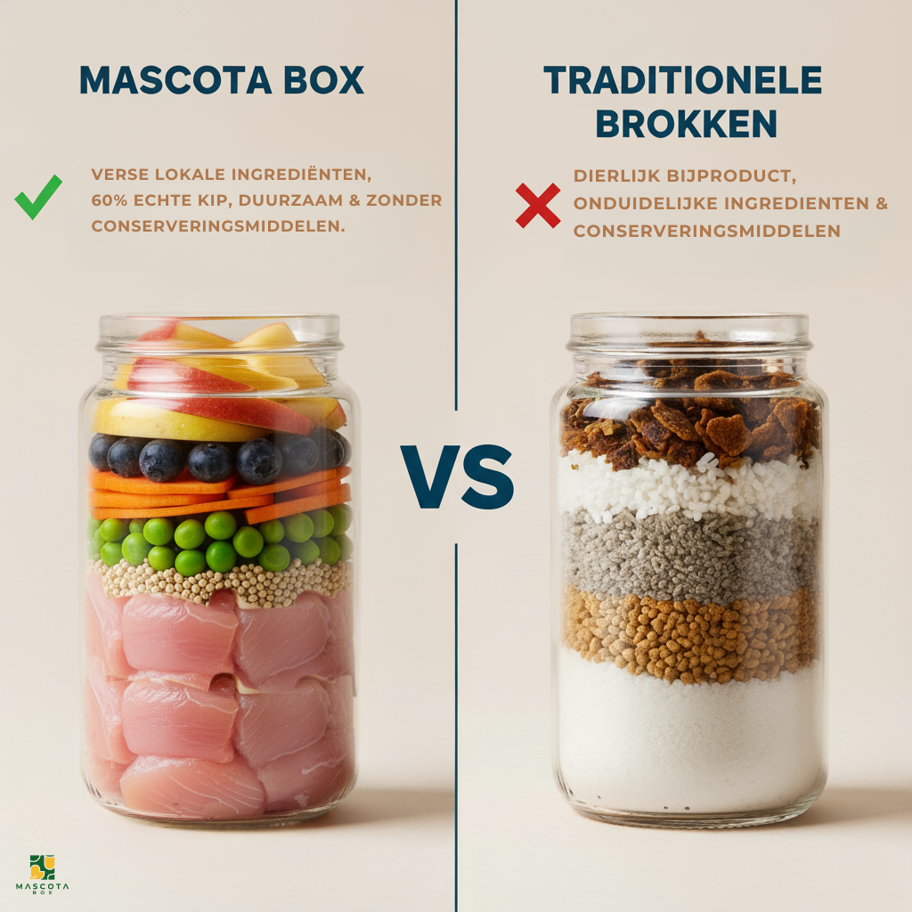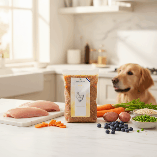 Versbereide kip 60% | aardappel | wortel | quinoa | erwten | rode linzen | witlof | bosbes | appel